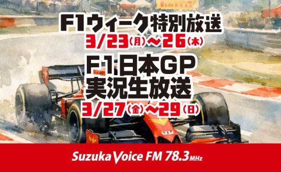 3月27日(金)〜29日(日)の3日間、鈴鹿ヴォイスFMでは「F1日本グランプリ」特別番組をお届けします!予選から決勝までのレース実況はもちろん、鈴鹿サーキットの最新イベント情報や、F1を楽しめる様々な情報、三重に来た方に買っていってほし…