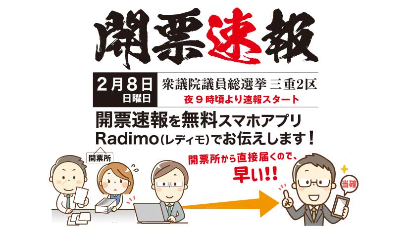 Suzuka Voice FMでは、2月8日(日)に行われる衆議院議員総選挙三重2区の開票速報をRadimoアプリの通知でお知らせします。